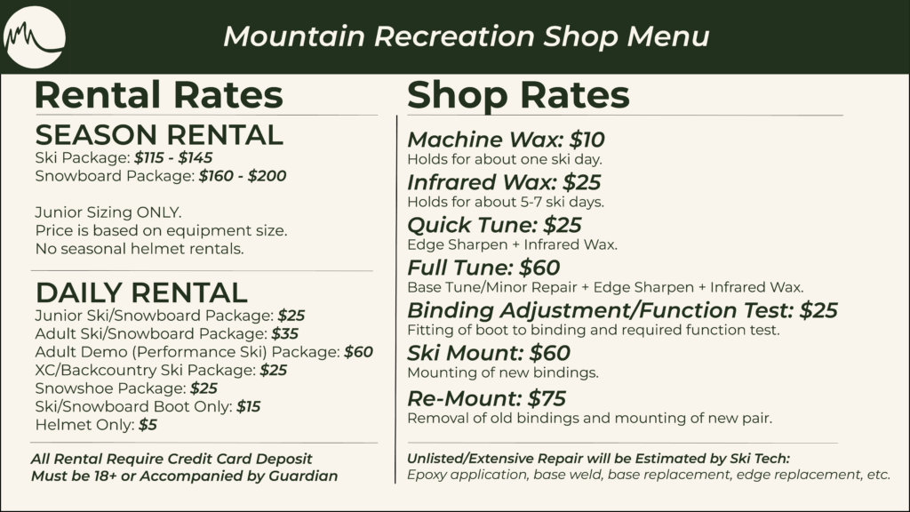 - $25 Junior ski/snowboard package, based on ski/snowboard size